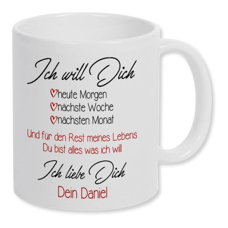 Mach deinem Herzensmenschen eine Freude – jetzt Tasse „Ich will dich …“ mit Personalisierung entdecken und verschenken.